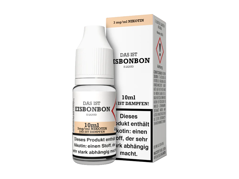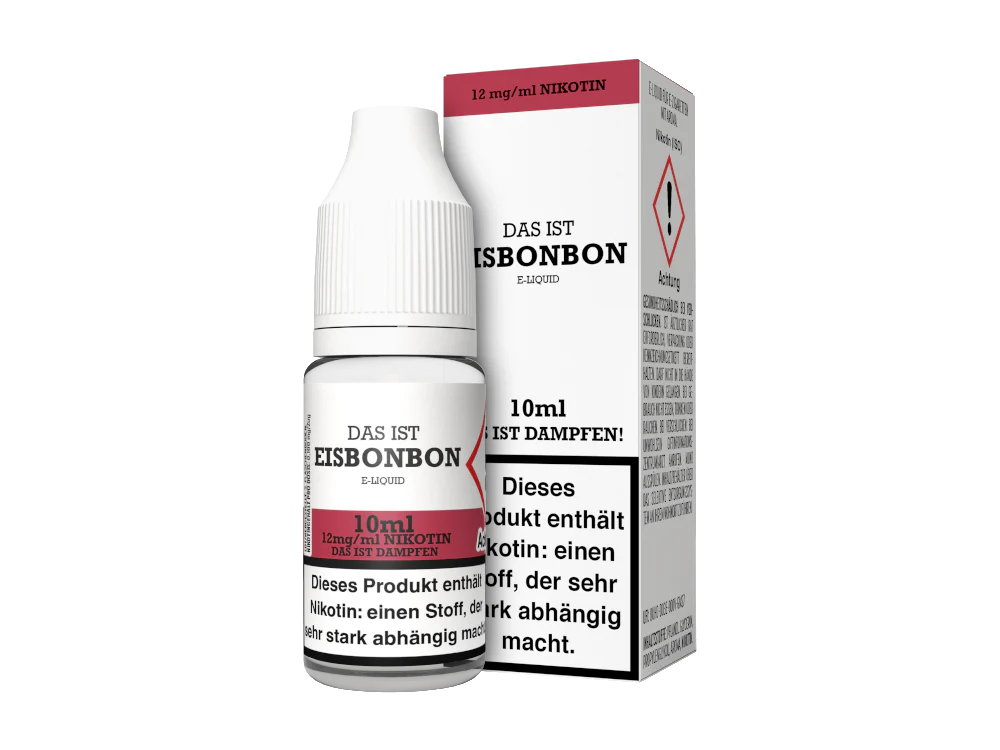 Das Eisbonbon e-Liquid ist ein Liquid der Marke Das ist Dampfen. In Kombination mit Ihrer E-Zigarette schmeckt das Liquid nach einem Eisbonbon. Das Liquid befindet sich mit 10 ml vorgefüllt in einer 10 ml Liquidflasche. Das Liquid können Sie in den drei Nikotinstärken 3 mg/ml, 6 mg/ml und 12 mg/ml erwerben. Es steht aber auch eine nikotinfreie Variante zur Wahl.
