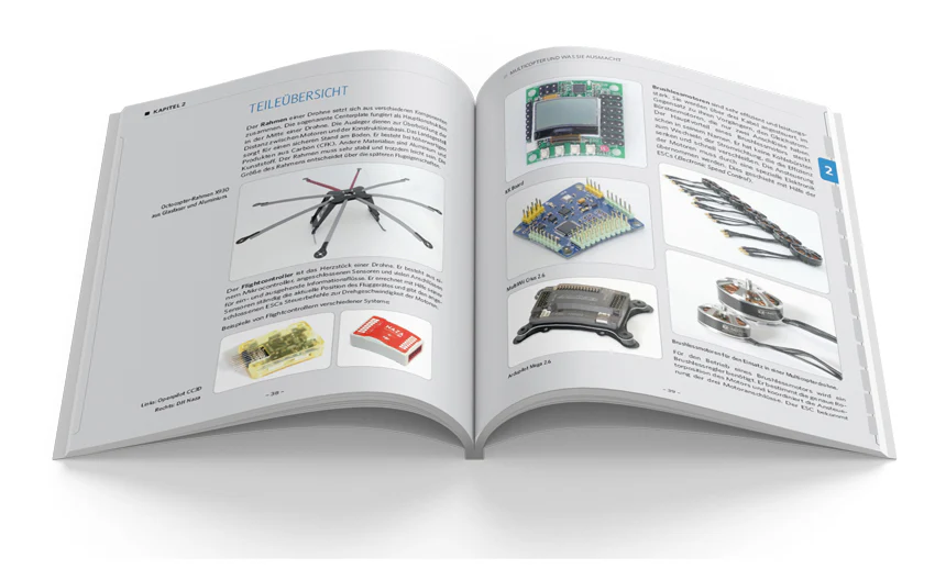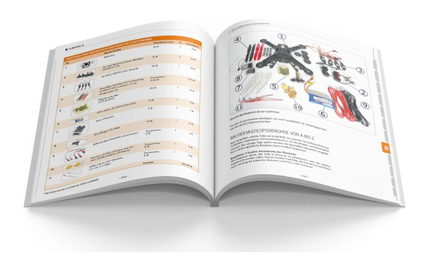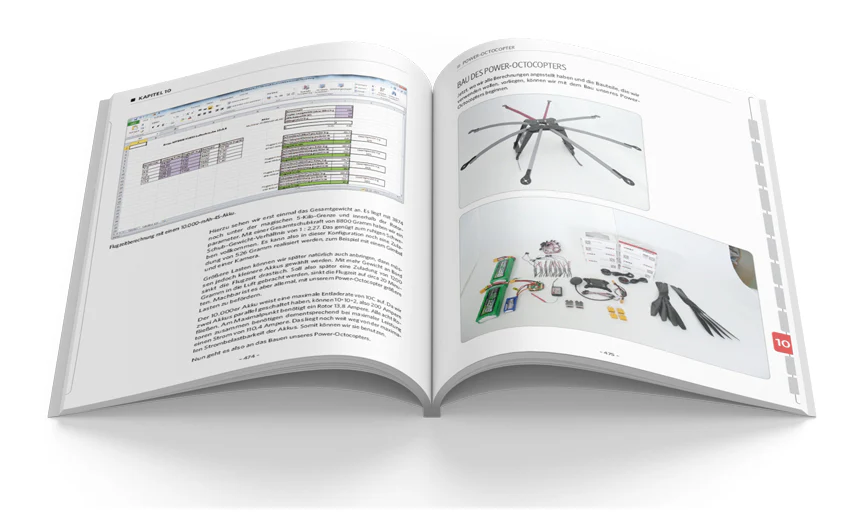 Insgesamt enthält das Buch drei ausführliche Selbstbauprojekte, von der günstigen Drohne für unter 150,- Euro über den vielseitig einsetzbaren Quadrocopter bis zum großen Octocopter für den Transport von Lasten.