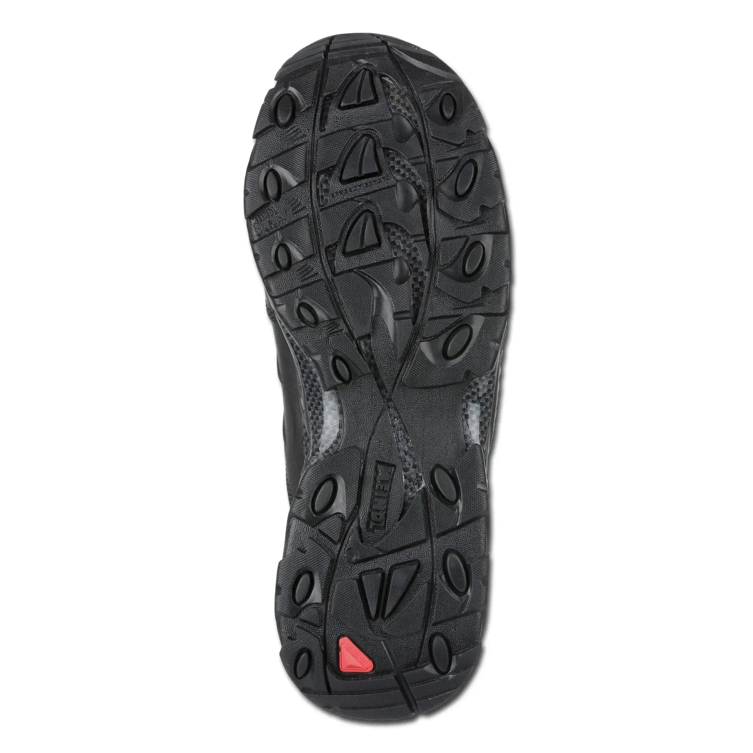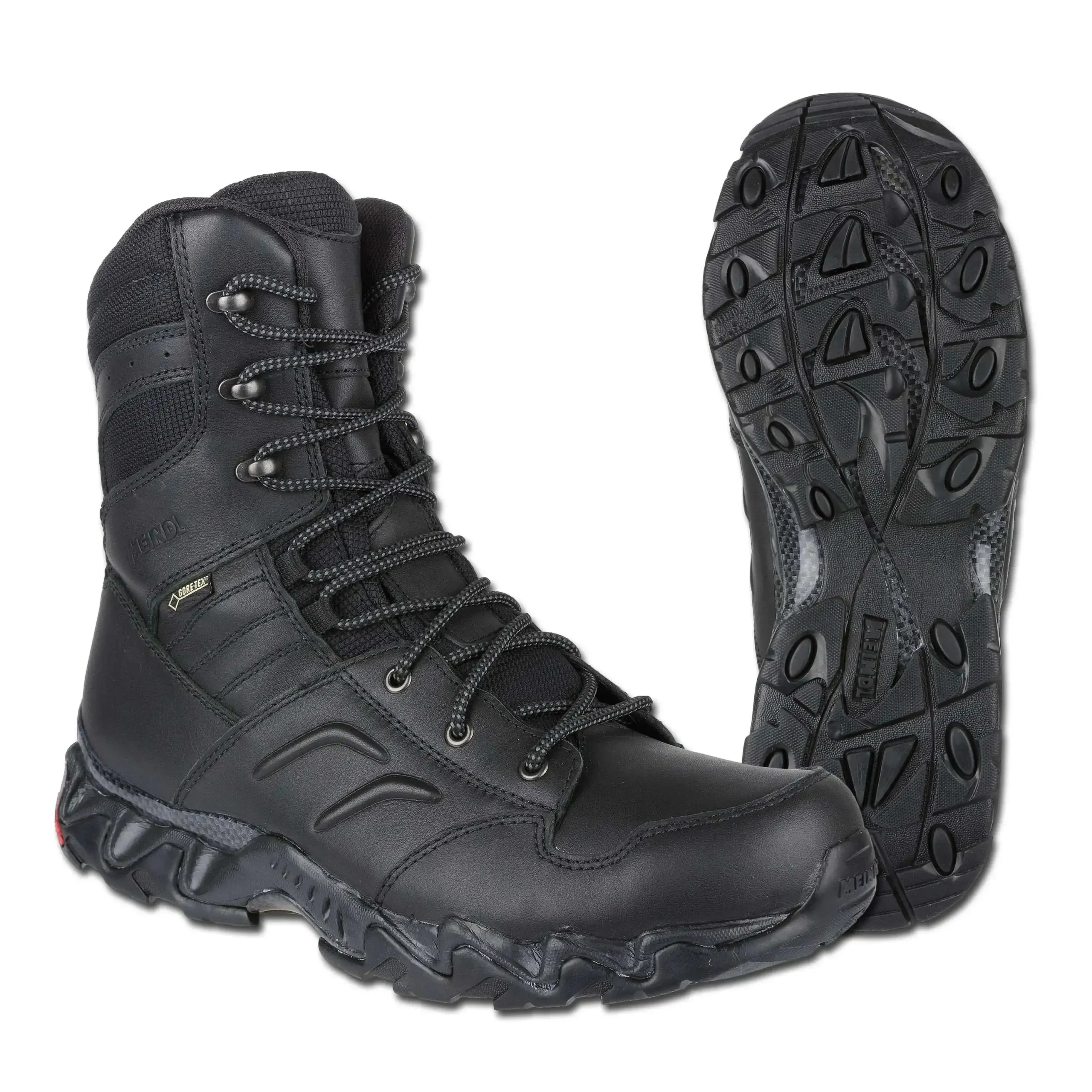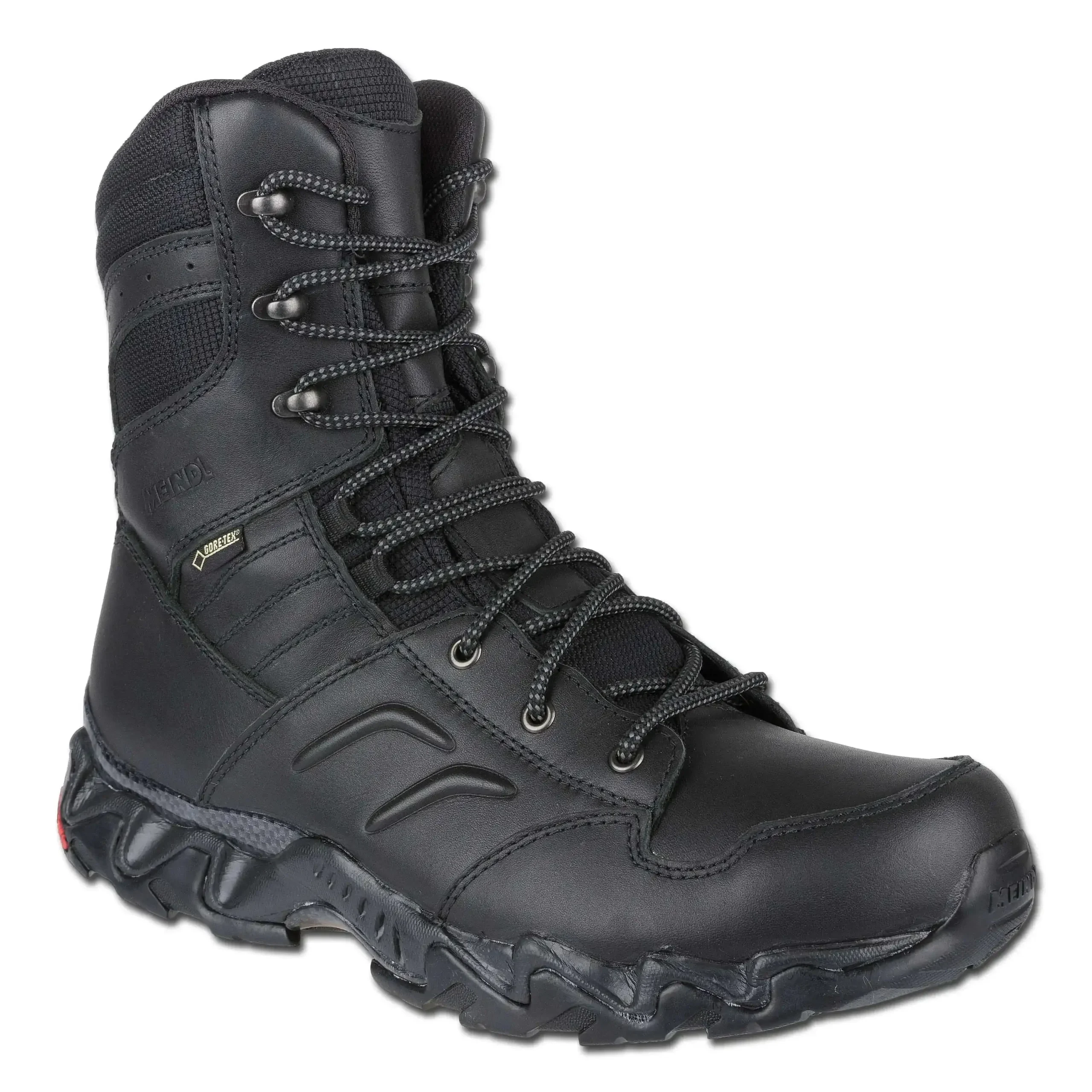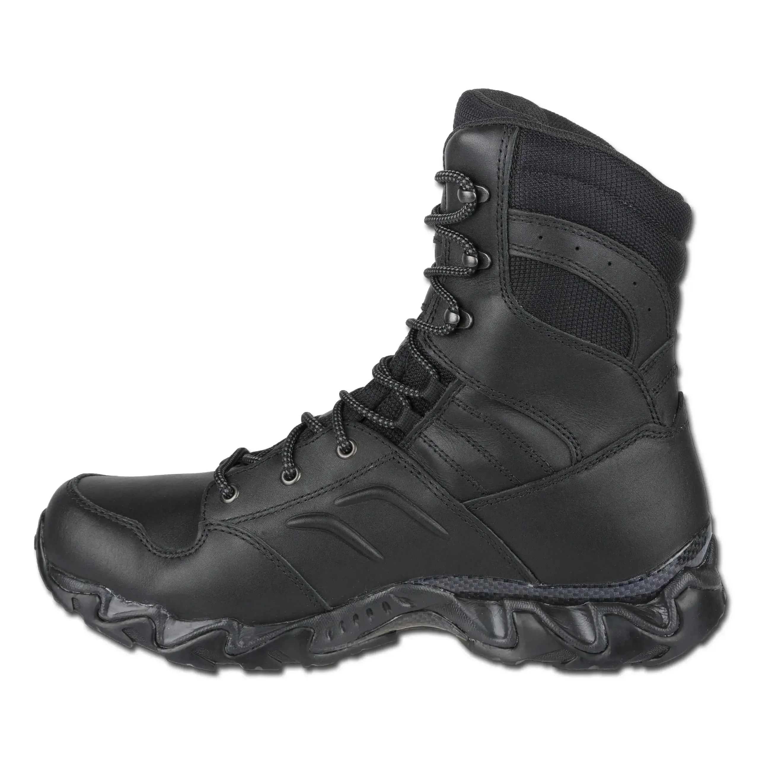 Der Meindl Black Cobra ist neu entwickelter Einsatzstiefel mit sportlicher Optik, der für nahezu jedes Gelände geeignet ist. Das flexible Obermaterial sowie eine Beugezone über der Ferse erhalten die natürliche Beweglichkeit, ohne die Stabilität des Fußes zu vernachlässigen. Eine Gore Membran sorgt für maximale Atmungsaktivität und macht den Schuh dauerhaft wasserdicht. Durch 2 Textilschlaufen im Knöchelbereich kann der richtige Fersensitz kontrolliert werden. Seitliche Polster und Lederverstärkungen erhöhen den Tragekomfort und die Stabilität. Die öl- und benzinbeständige Contagrip-Sohle bietet aufgrund ihrer Profilgestaltung hervorragende Trittsicherheit auch in extremem Gelände. Stone Shield Technologie in der Zwischensohle schützt den Fuß von unten.