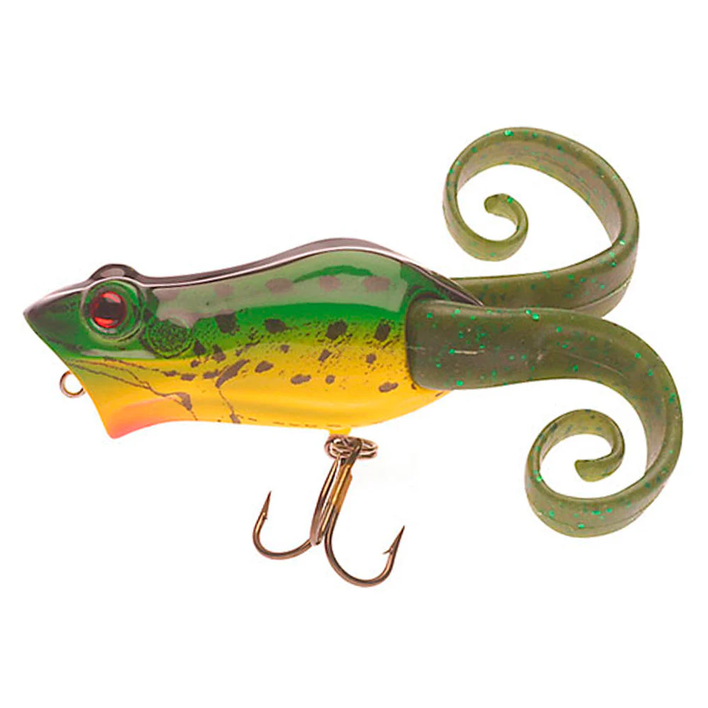 Der Frenzy Power Pop Frog ist ein Topwater-Köder aus dem Hause Berkley. Dieser hochfrequente Jerkbait mit „Plopp-Geräuschen“ an der Wasseroberfläche lockt besonders in den wärmeren Monaten die „Oberflächen-Räuber“ nur so an. Beim ruckartigen Einholen des besonderen Wobblers, wird in der gewölbten Kopfform Wasser verdrängt und nach oben geschleudert, welches dann ein platschendes Geräusch erzeugt. Die aggressiven Bisse erfolgen dann meistens in der Ruhephase, also den Pausen. Besonders gut eignet sich dieser Köder für flache und verkrautete Gewässer und animieren Hecht, Barsch und Schwarzbarsche zum ultimativen Biss.
