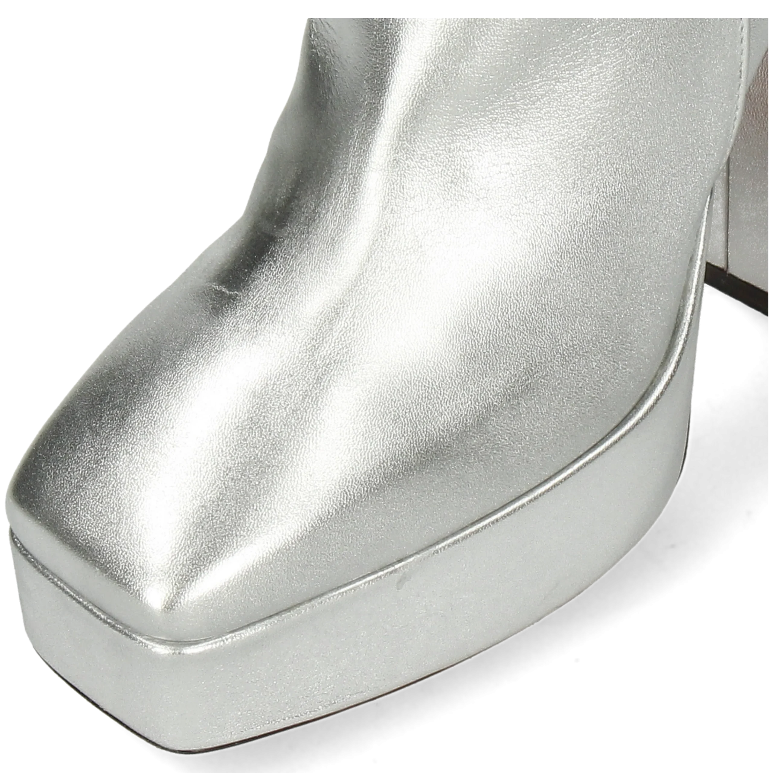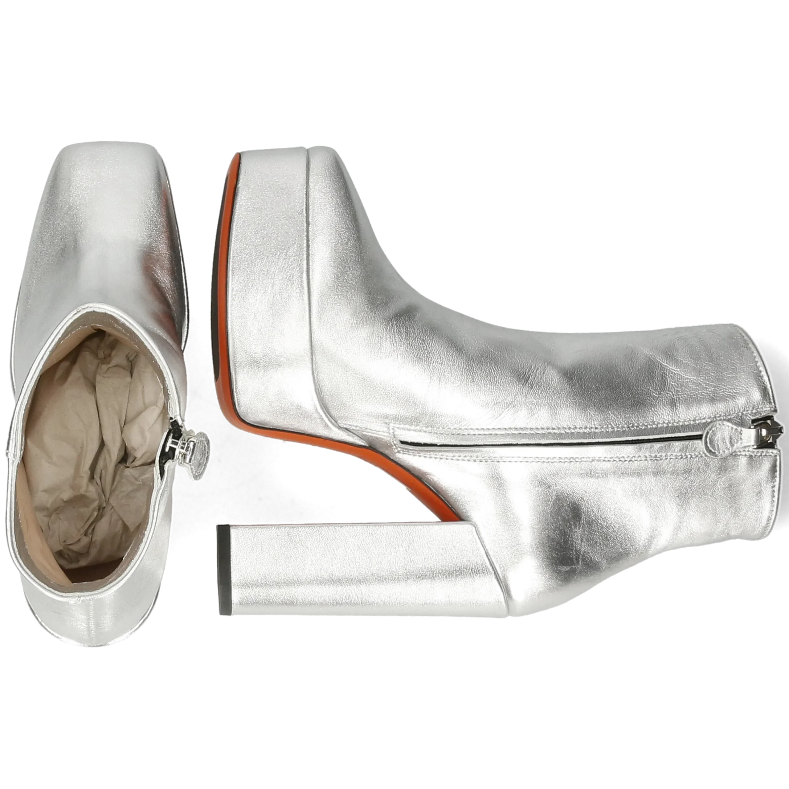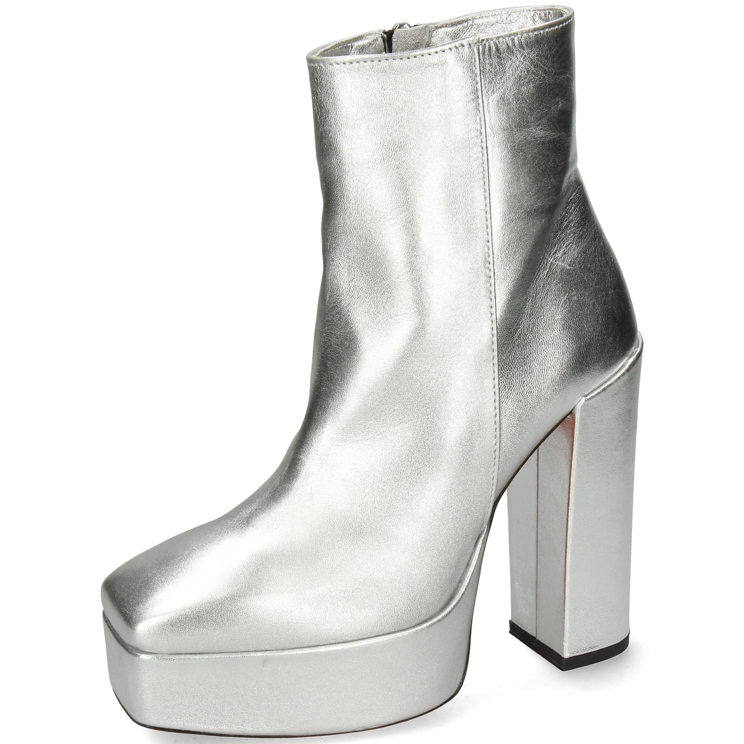 Melvin & Hamilton präsentiert seine exklusive Capsule Collection in Zusammenarbeit mit der italienischen Marke Fratelli Russo. Eine ganze Reihe von Damen-Stiefeletten mit Plateau-Blockabsatz wartet nun auf dich! Entdecke unser Modell Giselle 1, seinen Charakter und wie du es tragen kannst. Ein paar cm an Größe gewinnen! Als Erweiterung unseres Sortiments an Schuhen mit Absatz gibt es hier die Stiefeletten mit Plateau-Blockabsatz Giselle 1 aus Leder in silber. Sie passen sehr gut zu einem Freizeitlook, um deinem Outfit einen glamourösen Touch zu verleihen. Trage sie zu einem formellen Kleid, um am Abend elegant und feminin zu wirken!