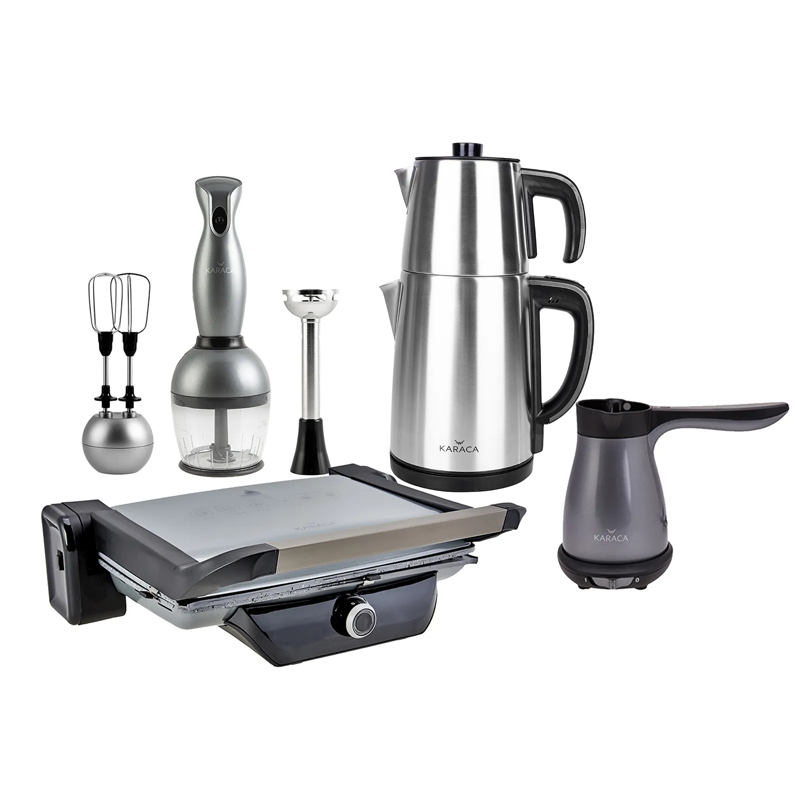 Karaca 4-teiliges Küchenkleingeräte Anthrazit Hochzeitspaket mit Edelstahl-Teemaschine