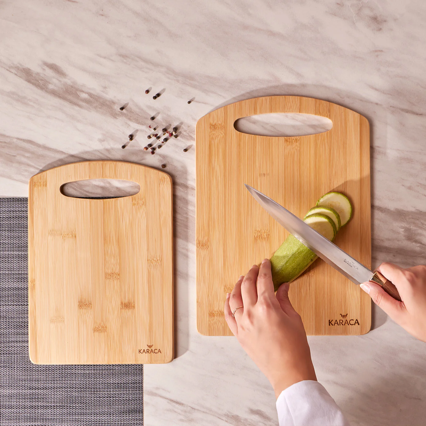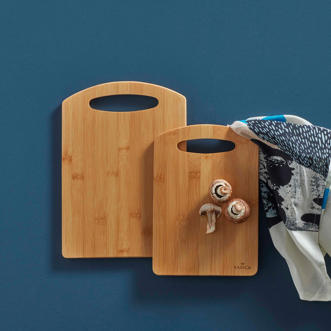 Karaca Stark 2-teiliges Schneidebrett wird in zwei Größen als M und L hergestellt. Die Maße des kleineren Schneidebretts sind 28x20x0,9 cm, während die Maße des größeren Bretts 33x24x0,9 cm betragen. Das messerfreundliche Bambus-Schneidebrett von Stark, das eine dünne, aber sehr hochwertige und solide Struktur hat, ist in Ihren Küchen die reinste Form der Natur! Um eine lange Lebensdauer zu gewährleisten, ist es nicht empfehlenswert, Bambusprodukte in der Spülmaschine zu reinigen. Legen Sie dieses Produkt, das eines der beliebtesten Doppelschneidebrettmodelle ist, jetzt in den Warenkorb, um es nicht zu verpassen!