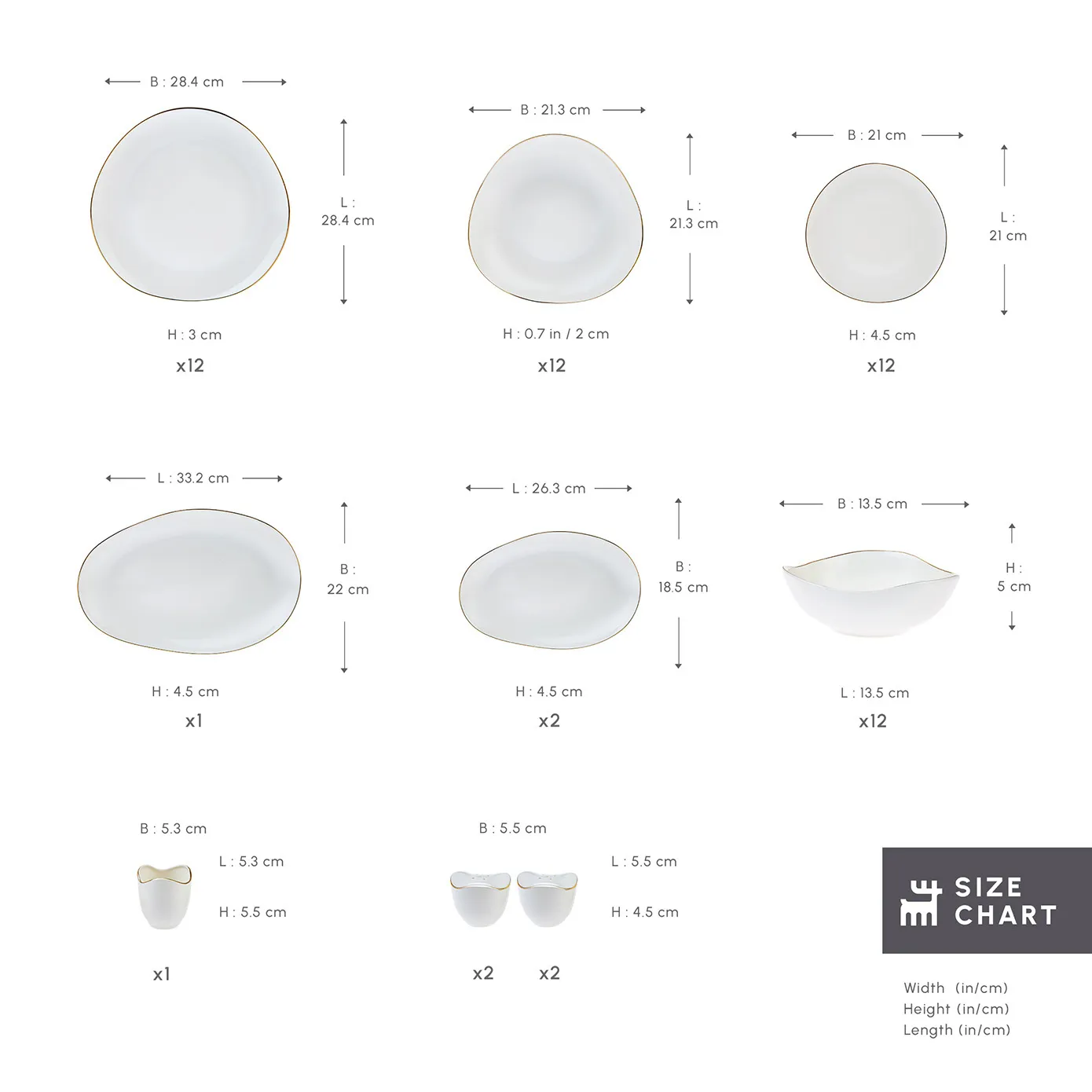 Mit dem Karaca Streamline Middle Tafelservice für 12 Personen, 56 teilig, decken Sie eine stilvolle Tafel für eine große Gästerunde ein. Das Geschirr besteht aus hochwertigem Knochenporzellan, das sich von herkömmlichem Porzellan durch seine hohe Kantenschlagfestigkeit abhebt. Das ovale Design in Kombination mit dem reinen Weiß und dem sorgfältig aufgetragenen Goldrand macht dieses Kombiservice zu etwas ganz Besonderem. Punkten kann das Essservice aber vor allem mit seiner reichhaltigen Ausstattung, dass es Ihnen erlaubt selbst mehrgängige Menüs aufzutischen. Mit diesem Set sind Sie tatsächlich auf alles vorbereitet, egal ob festliches Essen im Kreis der Familie oder bei einem Kochevent mit Ihren Freunden.