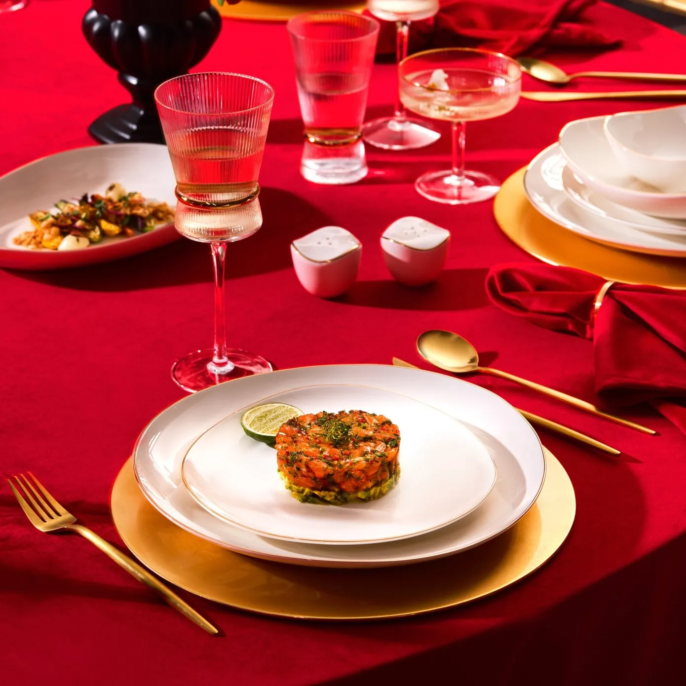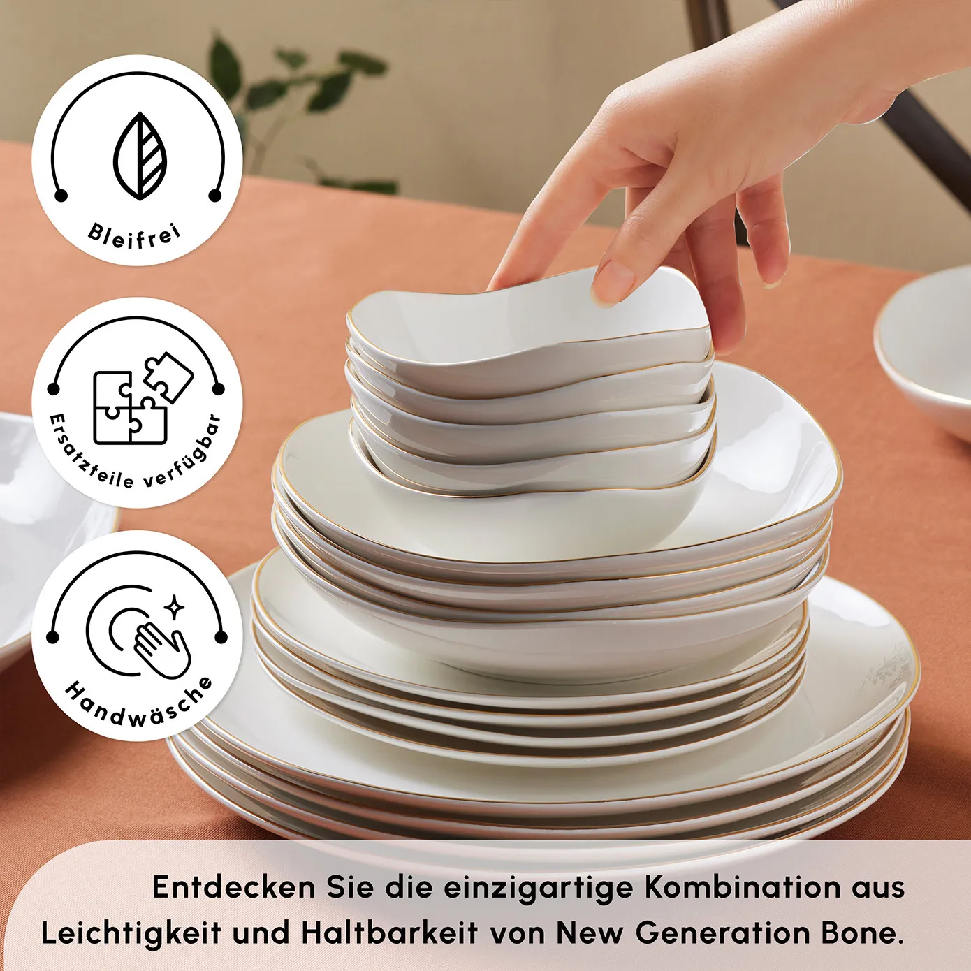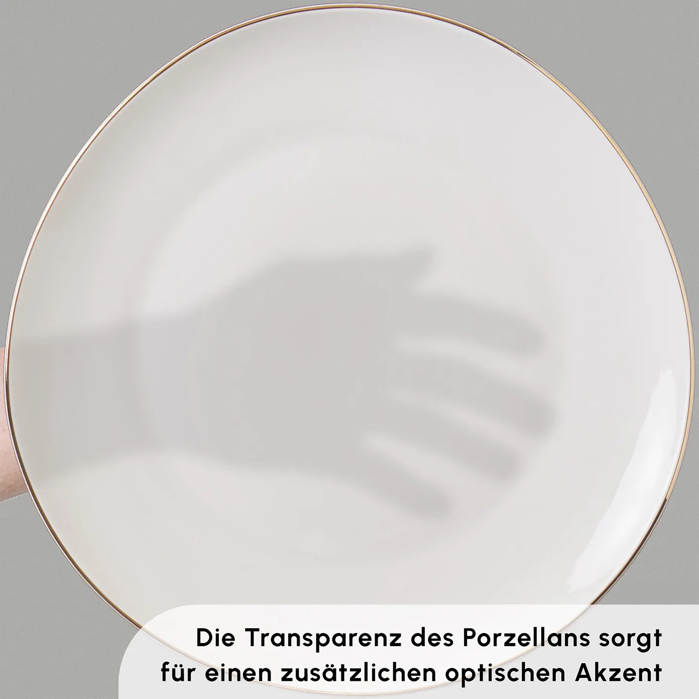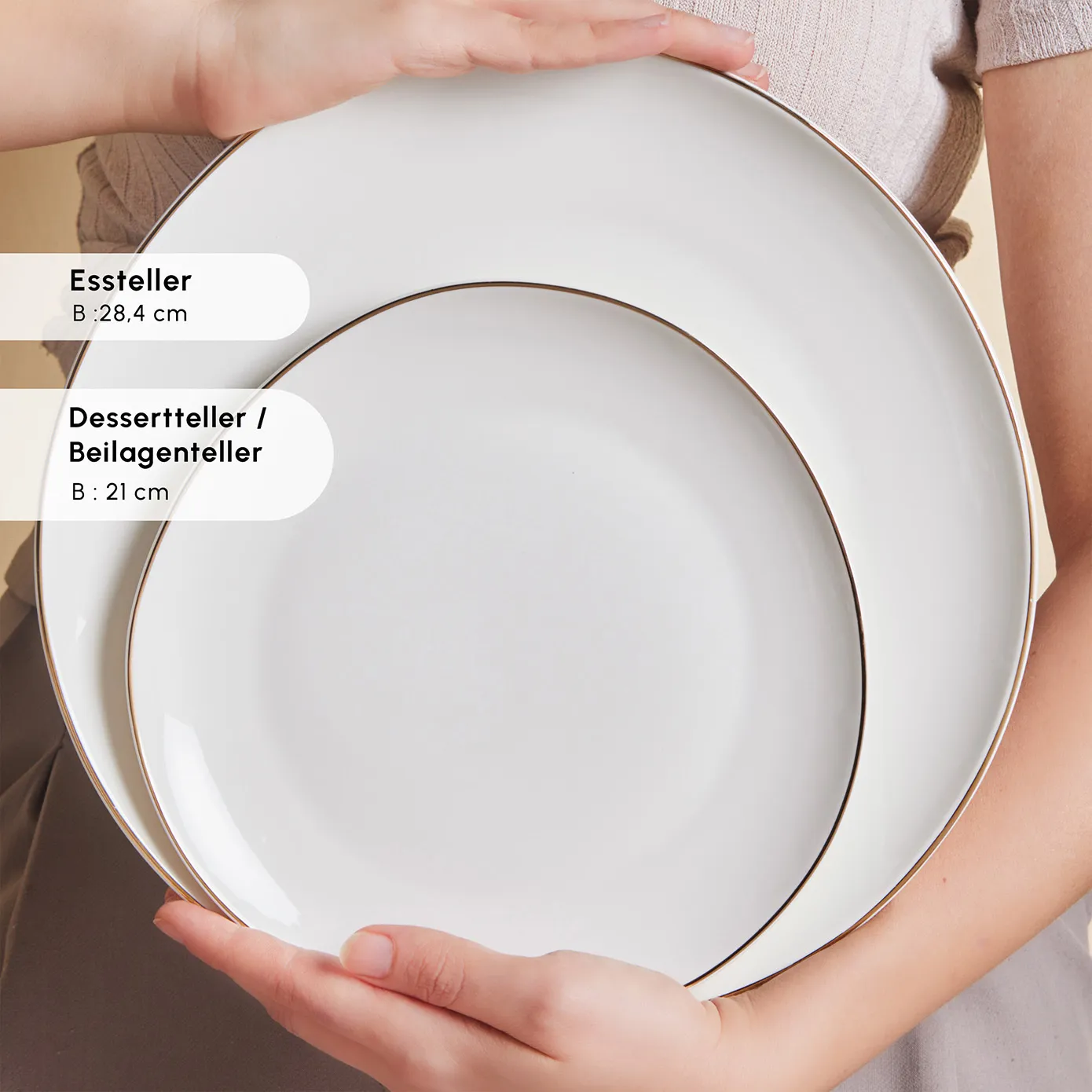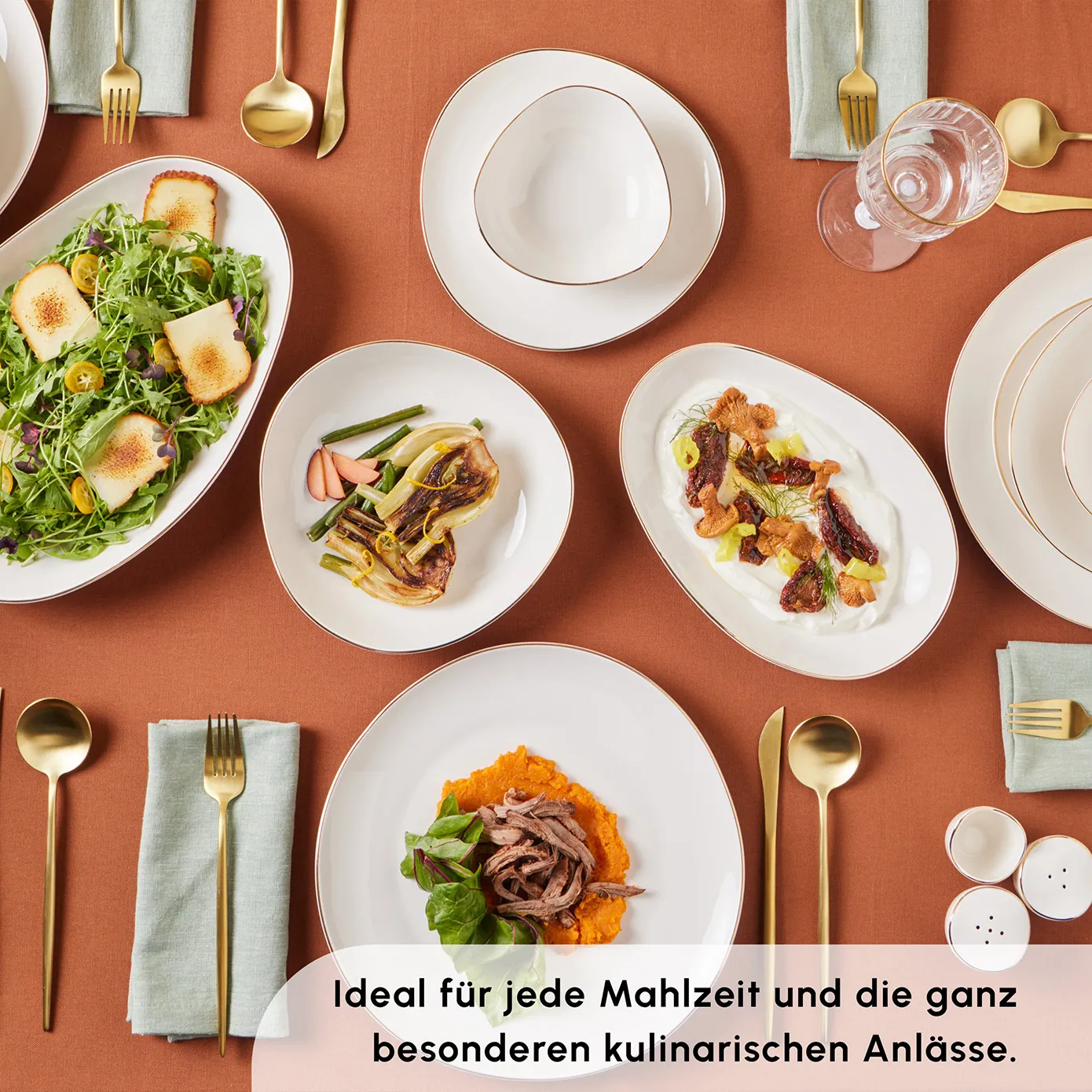 Wenn Porzellan, dann von Karaca! Das gilt auch für dieses schlichte Porzellanservice, das trotz seiner klaren Linien und einem Goldrand auf allen Tellern und Schüsseln mit einer außergewöhnlichen, ovalen Form beeindruckt. Ein weiterer Vorteil: ein 56 teiliges Geschirrset wie das Karaca Streamline Middle eignet sich ganz hervorragend, um viele Gäste oder eine große Familie zu bewirten, Speisen zu servieren und dank der großen Platzteller ins rechte Licht zu rücken. Kurzum: Dieses 56-teilige Tafelgeschirr für 12 Personen verleiht auch Ihrem Esstisch das gewisse Etwas. Mit seiner originellen Form und den edlen Goldrändern wird Ihr Esstisch zum Star. Ein weiterer Pluspunkt, dieses Geschirrs ist das Material, aus dem es gefertigt ist. Das Knochenporzellan ist anders als herkömmliche Porzellane schlagfester und widersteht kleine Stöße, ohne dass an den Rändern etwas abplatzt.