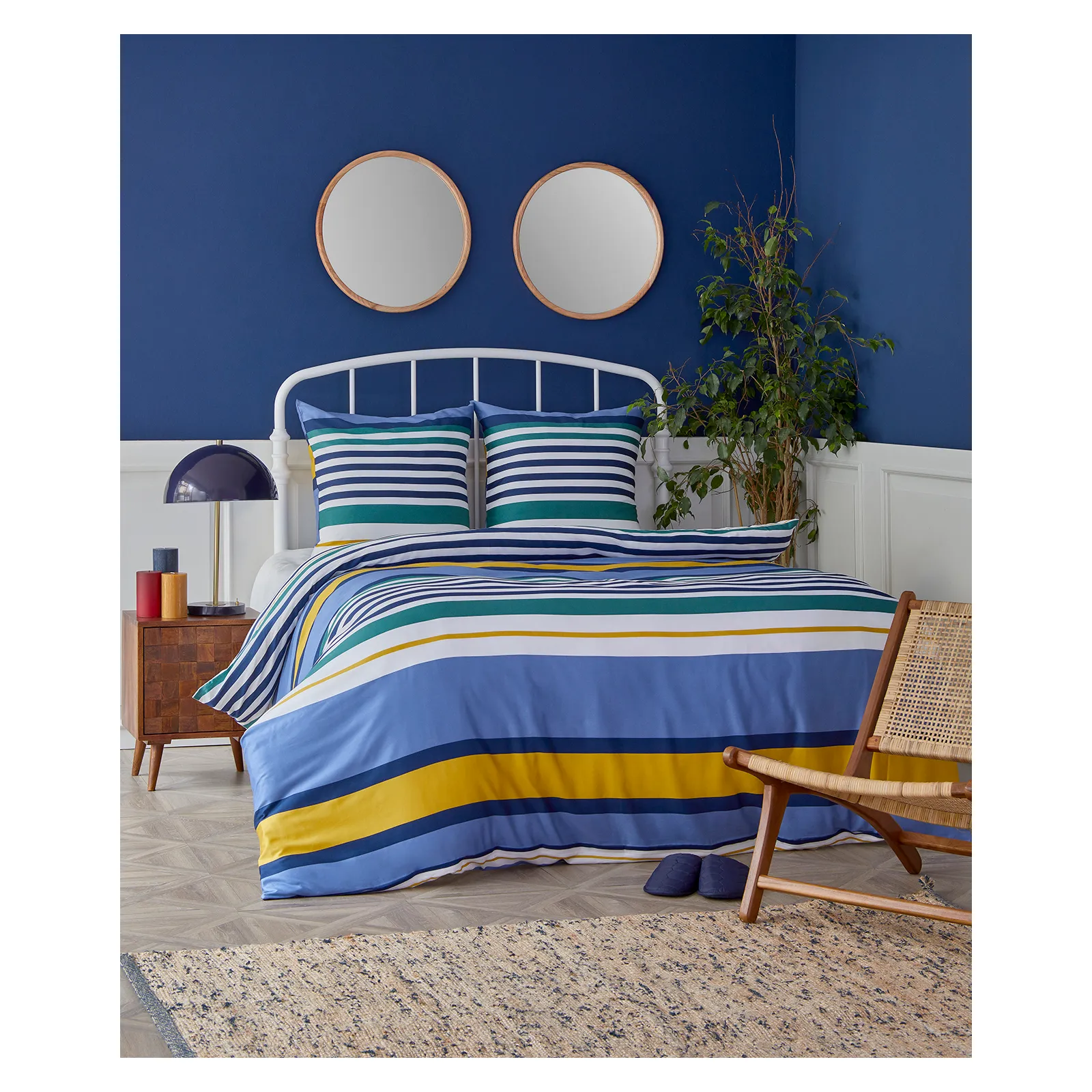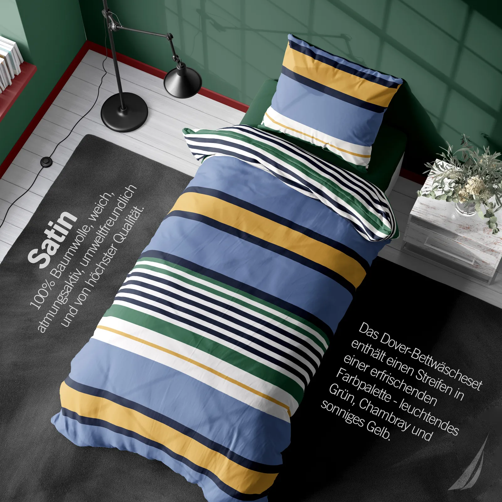 leuchtendes Grün, Chambray und sonniges Gelb. Diese Quer Streifen verleihen Ihrem Raum eine klare Dimension, während die Farbtöne zur Entspannung einladen