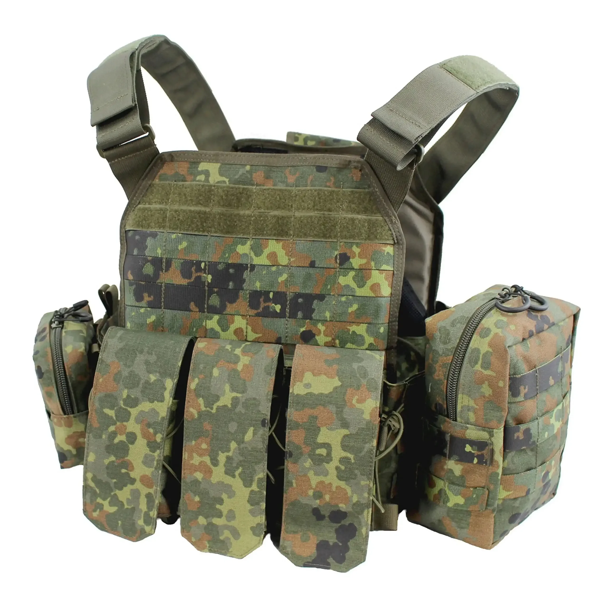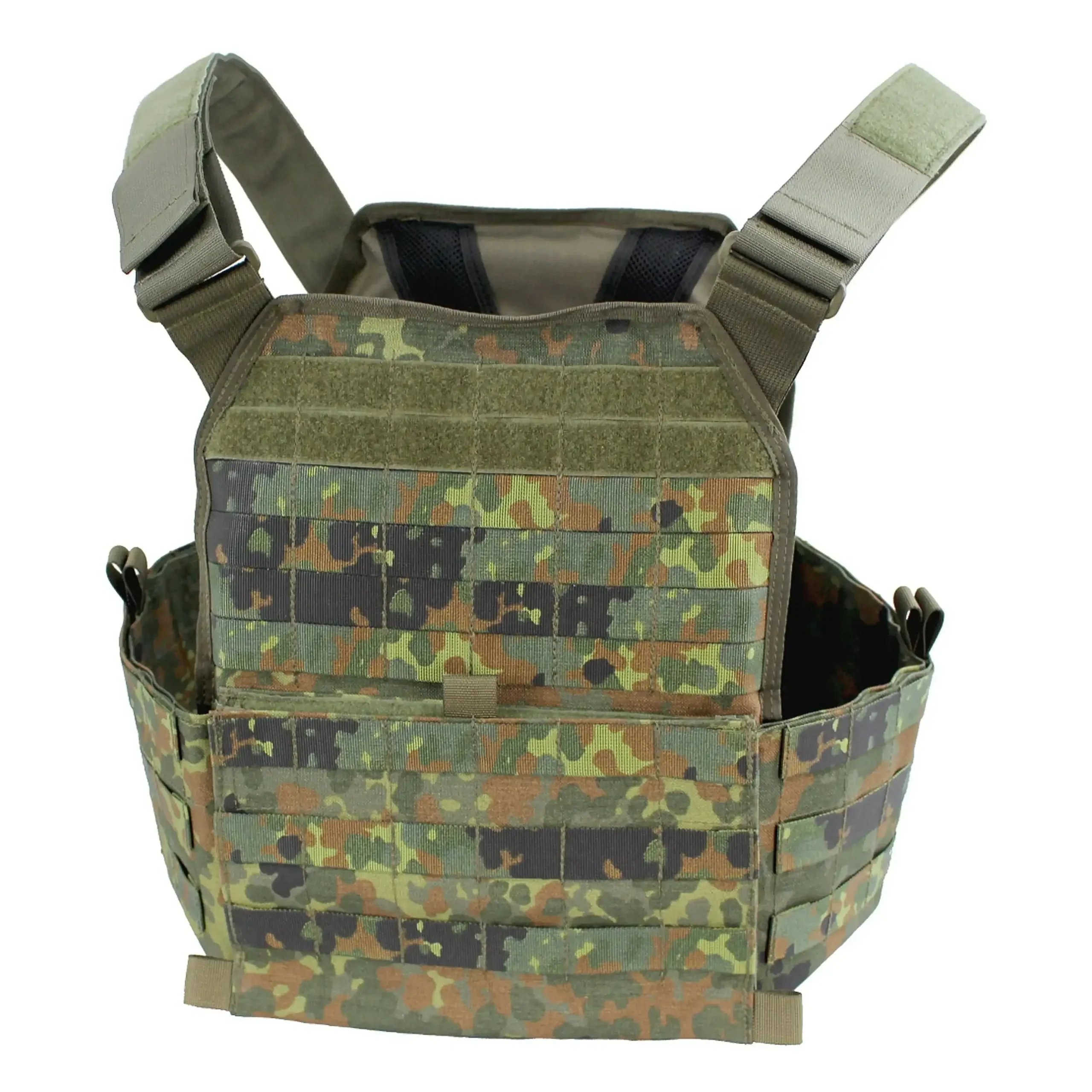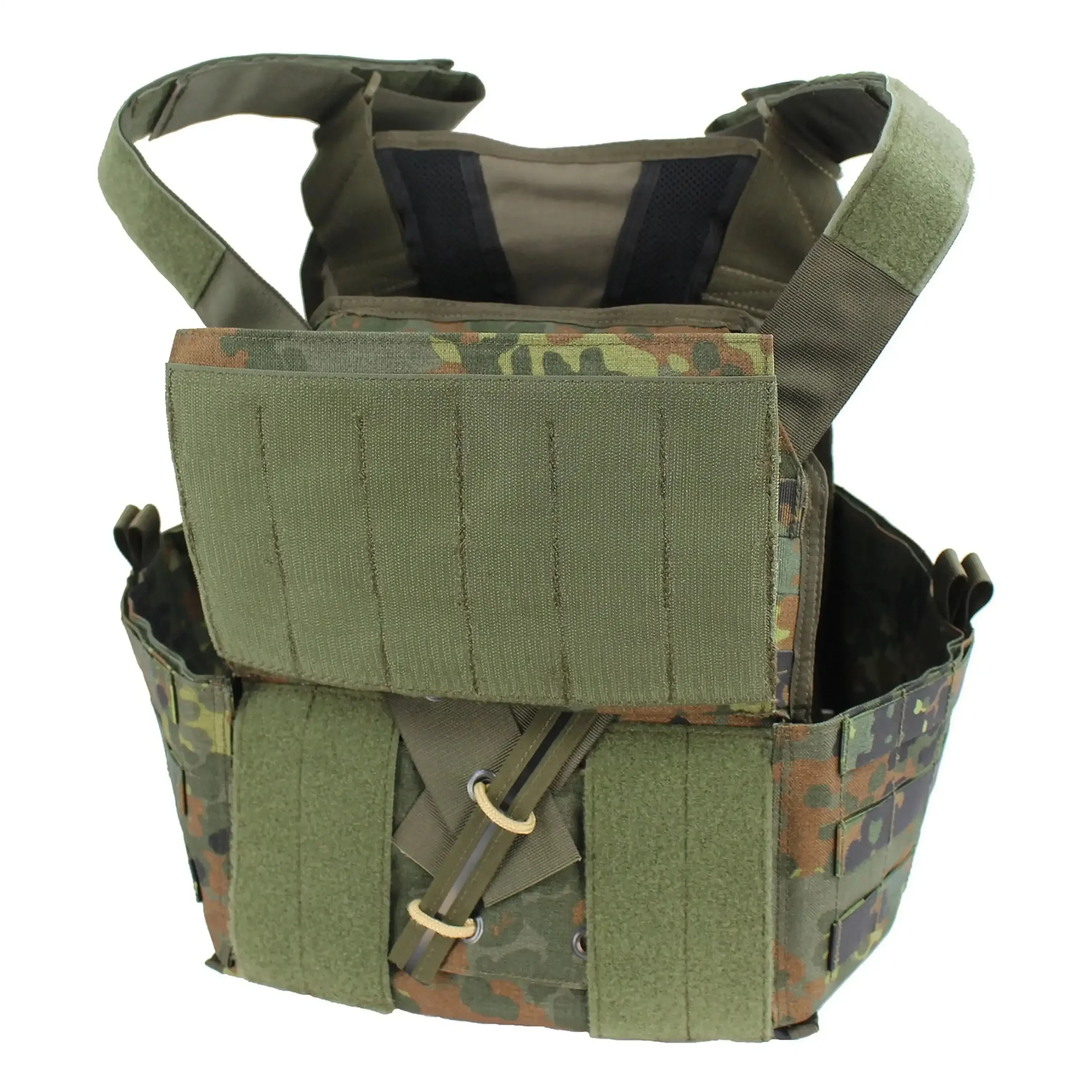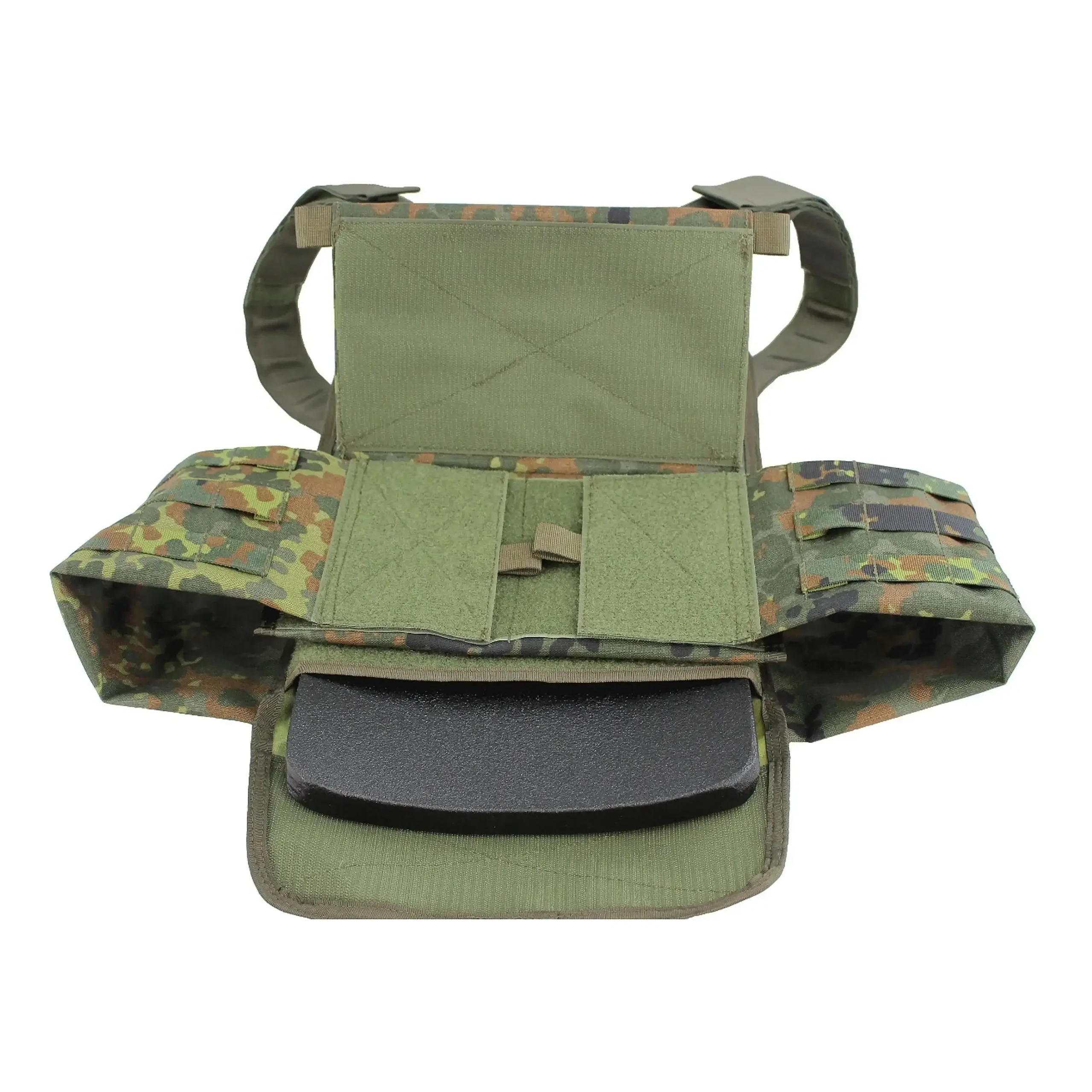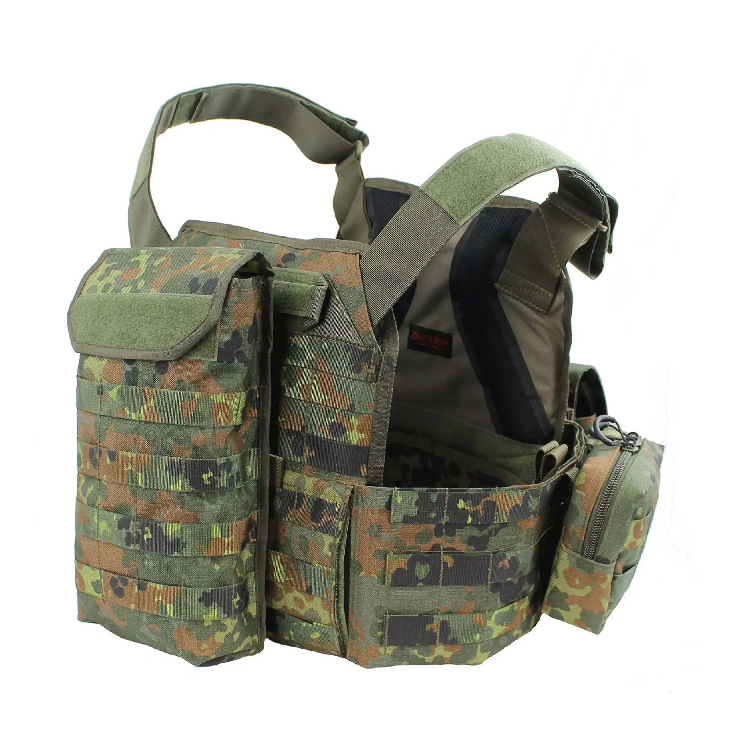 Der Zentauron Plattenträger Vulcan QRS ist die abwerfbare Variante des altbewährten Vulcan Plattenträgers. Das einzigartige Abwurfsystem kann wahlweise rechts wie links angebracht werden und ermöglicht auch eine teil- oder schrittweise Zerlegung. Die Führung für das Zugseil ist im inneren der Schulterträger und ermöglicht so sogar diese als Kabelkanal zu nutzen. Bei der Größe der passenden Ballistikplatten hat sich nichts zum normalen Vulcan verändert. SAPI M und Bw Standard Sk4 + Weichballistik sind geeignet. Der Vulcan QRS ist wie von Zentauron gewohnt, mit beiden Versionen das Vulcans und dem gesamten Zubehör kompatibel. Die Vorderseite das Vulcan QRS ist unverändert zum Basis Plattenträger und verfügt über eine Kangaroo Pouch in der vorderen Flap zum unterbringen von Magazinen oder Führungsmaterial. Auf der Innenseite befindet sich die Öffnung zur Plattentasche, sowie zwei ergonomisch geformte Polster, die den Tragekomfort und die Belüftung deutlich erhöhen. Der Vulcan QRS baut als Weiterentwicklung der Basisversion auf der gesamten Erfahrung mit diesem System auf und ist daher eine sinnvolle Erweiterung der Vulcan Familie für Truppenteile, die auf Grund ihres Aufgabenspektrums eine Abwurffunktion benötigen.