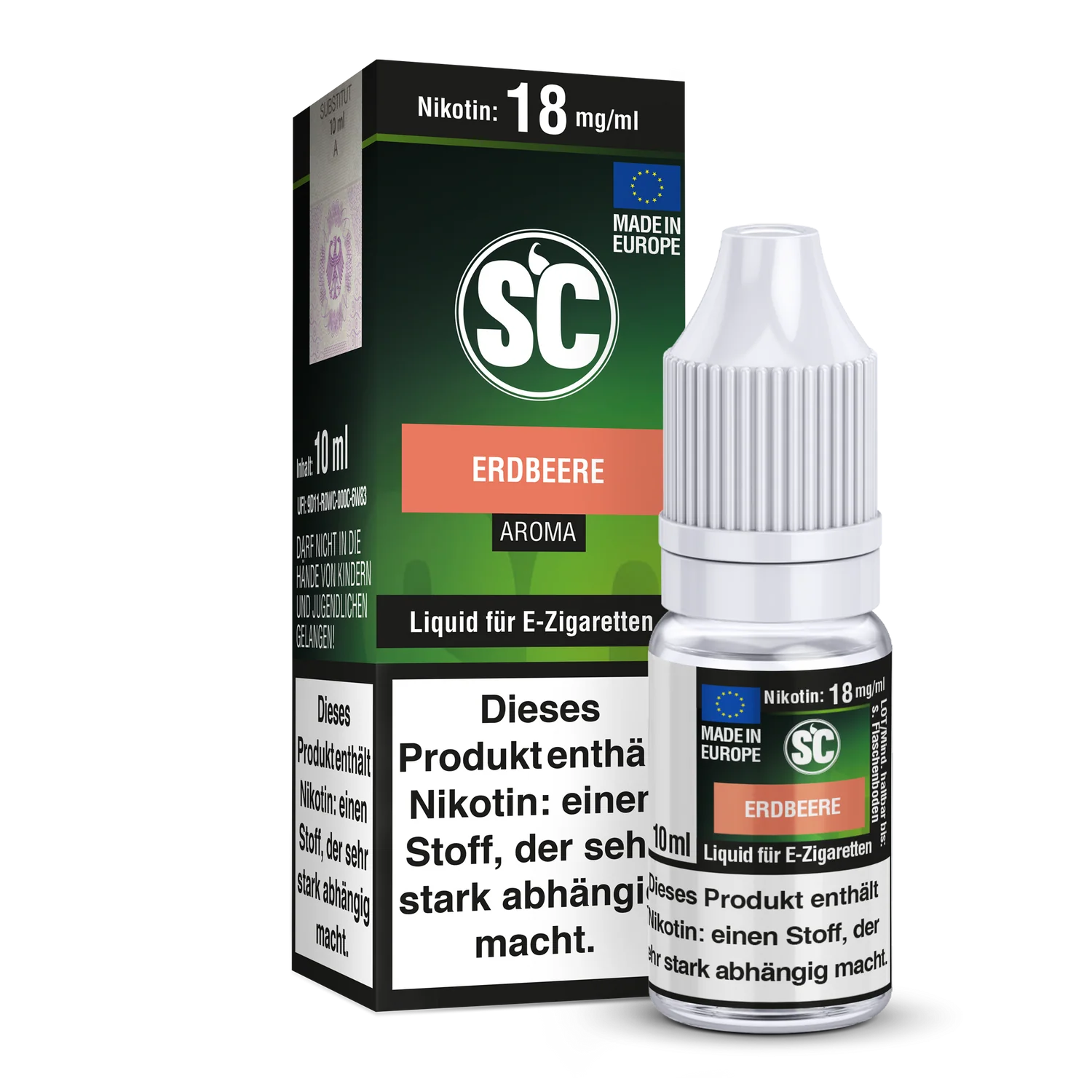 Mit jeder SC Liquid Flasche, erhalten Sie 10 ml Liquid von dem gewählten Liquid Aroma und der gewählten Stärke. Ihnen stehen insgesamt 5 Stärken mit und ohne Nikotin zu Auswahl. Das SC Erdbeere E-Zigaretten Liquid schmeckt beim Dampfen nach Erdbeeren.