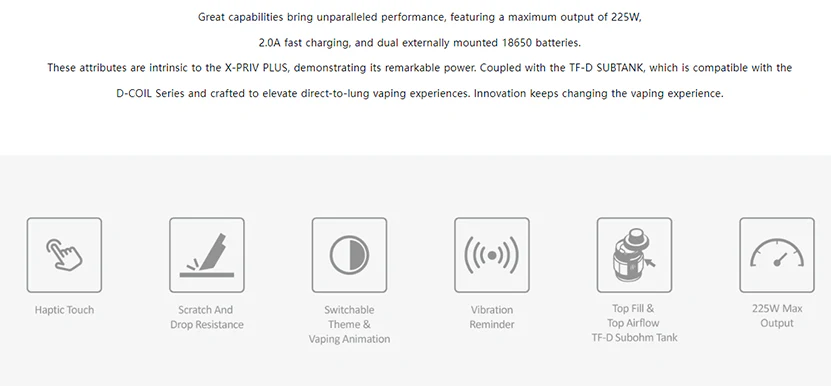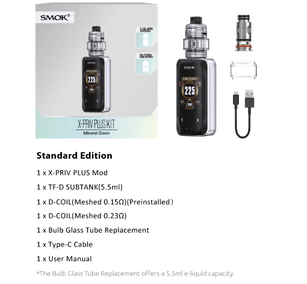 Das Smok X-Priv Plus Kit besteht aus dem Smok X-Priv Plus Mod und dem TF-D SubTank. Der Smok X-Priv Plus Mod unterstützt zwei externe 18650-Akkus mit 225 W maximaler Leistung und 2 A Schnellladung. Es verfügt über einen haptischen 2,01-Zoll-Bildschirm, umschaltbare Themen, Vaping-Animation und Vibrationserinnerung. Die große seitliche Feuertaste und die magnetische Akkukappe ermöglichen eine einfache Bedienung. Der TF-D SubTank mit 5,5 ml Fassungsvermögen verfügt über Top-Füllung, Top-Airflow, vierfachen Auslaufschutz und Kindersicherung. Er ist mit der SMOK D-Coil-Serie kompatibel.