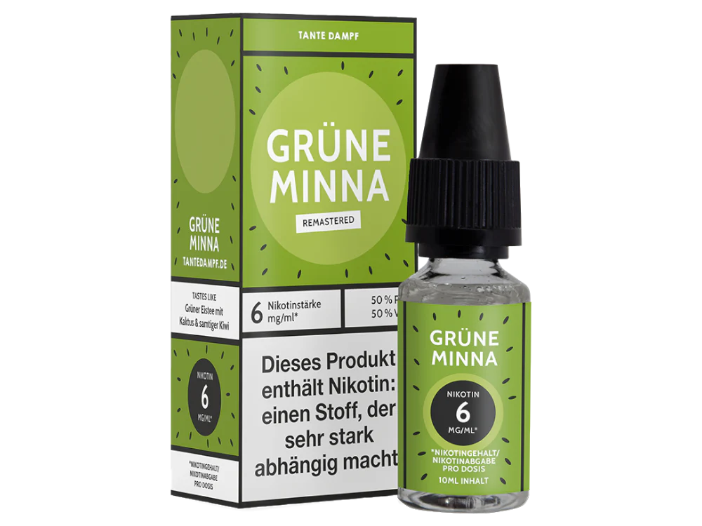 Wenn Sie das sofort verwendbare Liquid Grüne Minna Remastered der deutschen Marke Tante Dampf mit Ihrer E-Zigarette verdampfen, so werden Sie den Geschmack von grünem Eistee, Kaktus und Kiwi wahrnehmen. Das Liquid erhalten Sie in drei unterschiedlichen Nikotinstärken. Unabhängig von der von Ihnen gewählten Stärke, wird Ihnen eine 10 ml Flasche mit selbigem Inhalt geliefert.Auszeichnung gemäß CLP-Verordnung (EG) Nr. 1272/2008