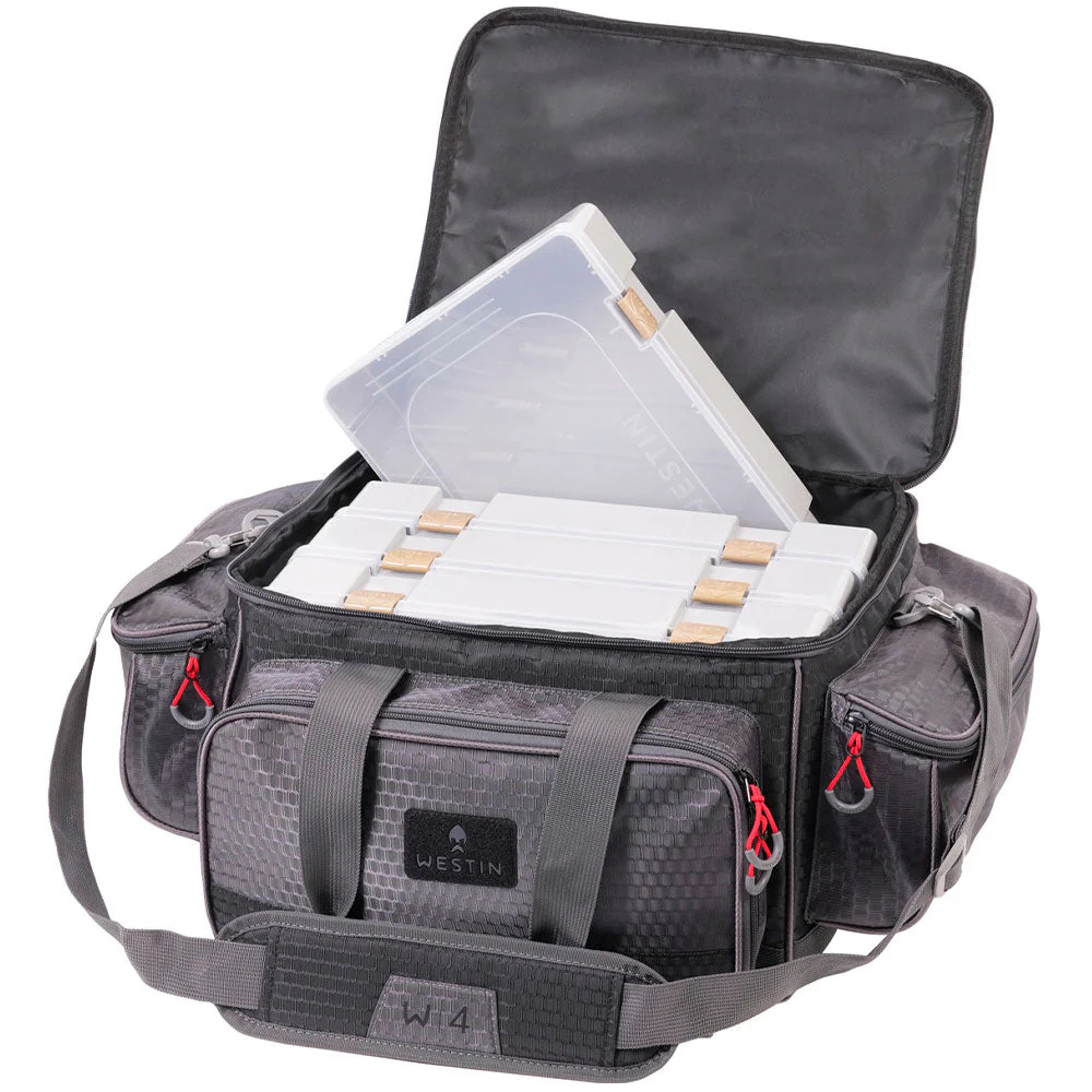 Wie der Name schon verrät, ist der Westin W4 Jumbo Lure Loader eine extra große Schultertasche mit viel Platz für deine Köder, Terminal Tackle und Werkzeuge. Damit du auch direkt von Anfang an gut organisiert bist, sind bereits 4 Tackleboxen enthalten, die im geräumigen Hauptfach Platz finden. Neben diesem Hauptfach bietet der W4 Jumbo Lure Loader noch weiteren Stauraum und nützliche Extras. So verfügt eine der beiden großen Seitentaschen über einen elastischen Werkzeugorganisator, der deine wichtigsten Werkzeuge an der richtigen Stelle hält. Die große Fronttasche hingegen ist mit einem Netzinnenfach ausgestattet und eignet sich bestens zur Aufbewahrung von Terminal Tackle oder Vorfachmaterial wie z.B. Fluorocarbon. Man kann getrost sagen, dass der Westin W4 Jumbo Lure Loader ein echtes Raumwunder ist.